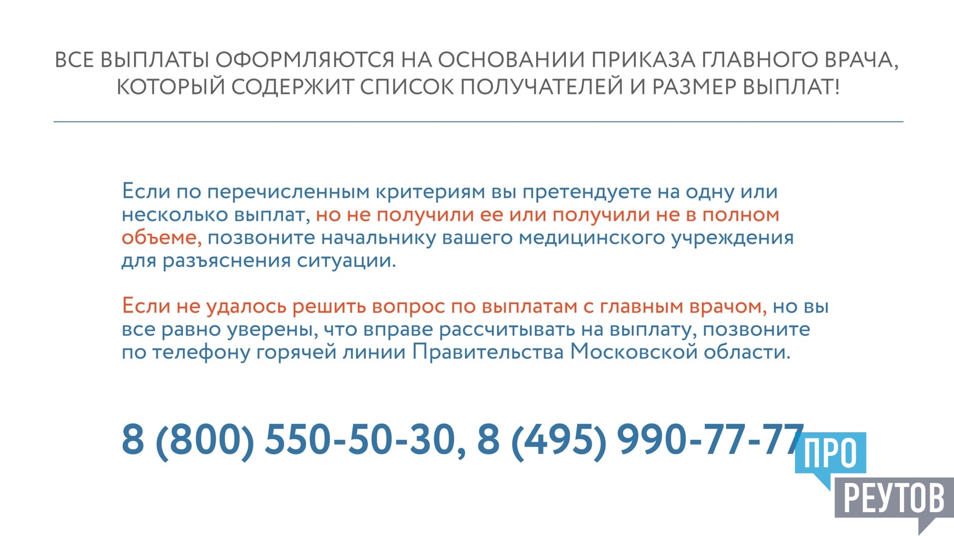 Все вышеперечисленные доплаты уже перечисляются сотрудникам медучреждений. В случае возникновения вопросов медработникам рекомендуют обращаться к своему главврачу. Также работает горячая линия - 8 (495) 990-77-77 или 8 (800) 550-50-30. Кроме того, в Подмосковье планируют запустить онлайн-калькулятор для расчёта выплат медработникам.