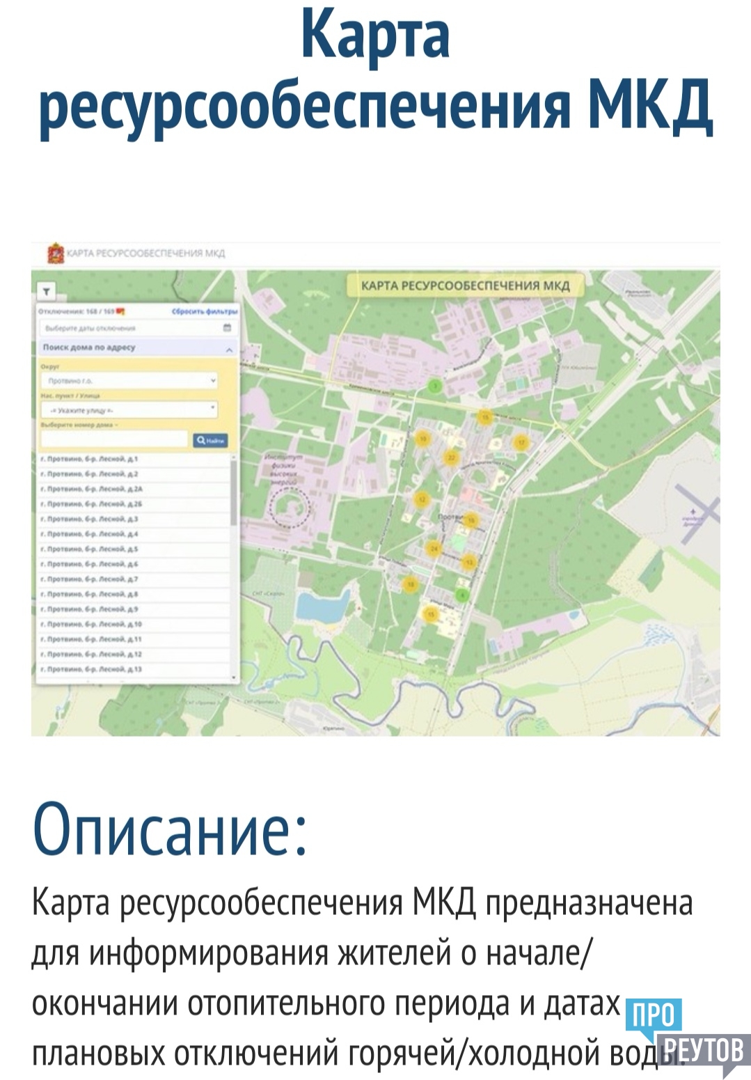 «Проект «Карта ресурсообеспечения МКД» предназначен для информирования жителей о начале и окончании отопительного периода и датах плановых отключений горячей или холодной воды. Реализована возможность подписки на уведомления о плановых отключениях за 30, семь дней и за день до события на электронную почту или через Telegram-бот @otklyucheniya_mo_bot», — говорится в сообщении.