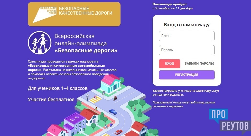 В рамках национального проекта «Безопасные и качественные автомобильные дороги», в период с 30 ноября по 11 декабря 2020 года на образовательной платформе Учи.ру пройдет всероссийская онлайн-олимпиада «Безопасные дороги» (dorogi.uchi.ru) на знание основ безопасного поведения на дорогах для школьников 1-4 классов. Олимпиада организована Автономной некоммерческой организацией «Национальные приоритеты» совместно с ГУОБДД МВД России, Минтрансом России и Росавтодором.