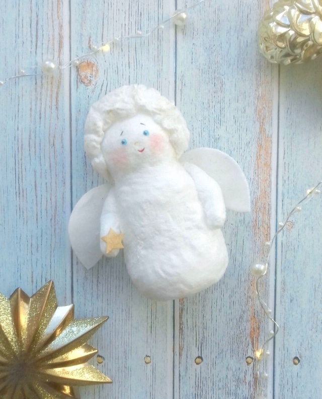 Ангелочек — одна из самых популярных и, пожалуй, лучших игрушек для начинающих. Для работы вам понадобятся хлопковая вата, картофельный крахмал или клей ПВА, белые нитки, ножницы, плоская и тонкая кисти и… немного волшебства.
