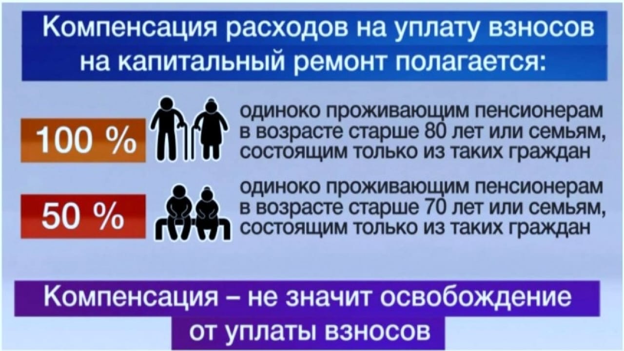в возрасте от 70 лет, а также семьи из неработающих пенсионеров в возрасте от 70 лет получают 50%-ю компенсацию на оплату взноса за капитальный ремонт, те же категории граждан, достигшие 80 лет, – 100%-ю компенсацию. Размер компенсации рассчитывается исходя из стандарта нормативной площади жилого помещения и минимального размера взноса на капремонт. Для одиноко проживающих граждан стандарт нормативной площади жилого помещения установлен в размере 42 квадратных метра, но не более занимаемой жилищной площади, семьи из двух человек – 21 квадратный метр на человека, семьи из трех и более человек – по 18 квадратных метров на человека.