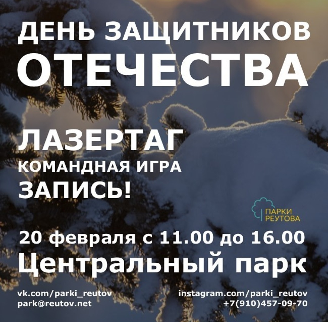 «В Центральном городском парке Реутова 20 февраля пройдет высокотехнологическая игра, происходящая в реальном времени и пространстве, «Лазертаг». Суть игры состоит в поражении игроков-противников безопасными лазерными выстрелами из бластера-автомата. Сражения пройдут с 11:00 до 16:00, после чего на главную сцену парка выйдет ансамбль народной песни «Любо-мило». А в арт-пространстве «За сценой» в 13:00 проведут мастер-класс «Подарок для папы: декор кружки». Кроме того, любители просмотра фильмов на свежем воздухе смогут посмотреть 23 февраля в 18:00 х/ф «Калашников», главным роль в котором играет российский актер театра и кино из Реутова – Юрий Борисов», - говорится в сообщении.