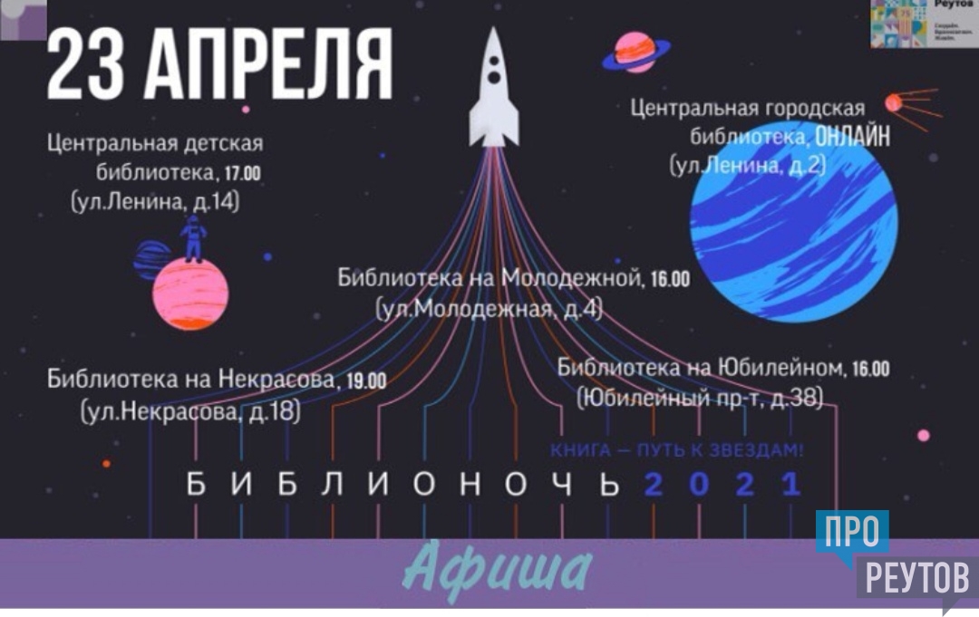 ««Библионочь» приурочена к Году науки и технологий и посвящена 60-летию полета Юрия Гагарина. Акция пройдет под девизом «Книга – путь к звездам». В библиотеках Реутова запланированы несколько десятков мероприятий в офлайн- и онлайн-форматах. Акция в учреждениях культуры городского округа стартует в 16.00», - говорится в сообщении.
