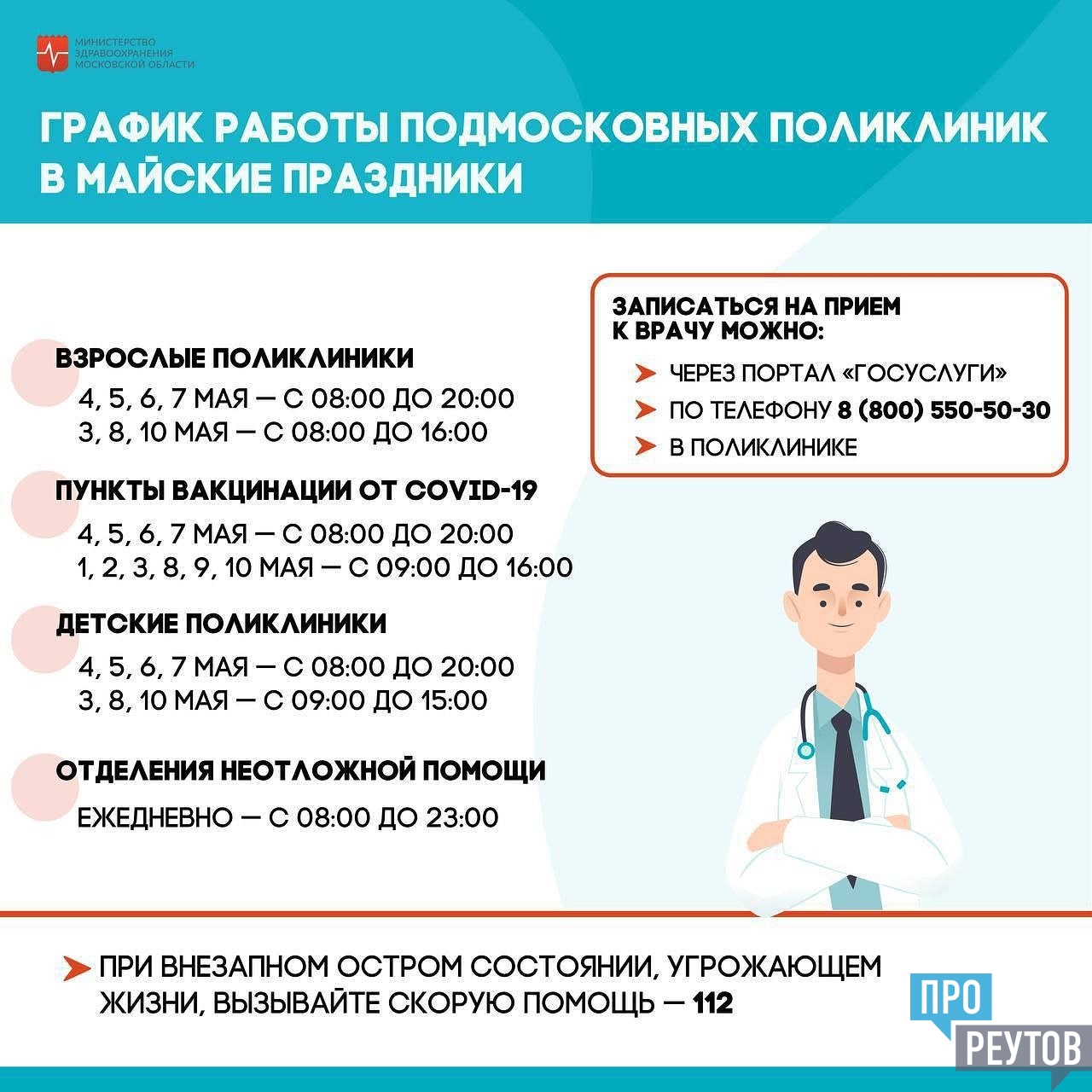 В Московской области утверждён график работы государственных медицинских организаций на период с 1 по 10 мая. Так, амбулаторно-поликлиническая служба, оказывающая помощь взрослому населению, будет работать 4, 5, 6, 7 мая – с 08:00 до 20:00, а 3, 8 и 10 мая – с 08.00 до 16.00.