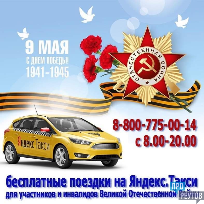 Правительство Московской области вместе с Яндекс.Такси сделает бесплатным проезд в такси для участников Великой Отечественной войны на период с 7 по 9 мая. Ветераны и инвалиды ВОВ, зарегистрированные в Московской области, смогут воспользоваться бесплатным такси на территории Подмосковья и Москвы независимо от целей поездки - в медучреждения, органы соцзащиты, на дачу и др.