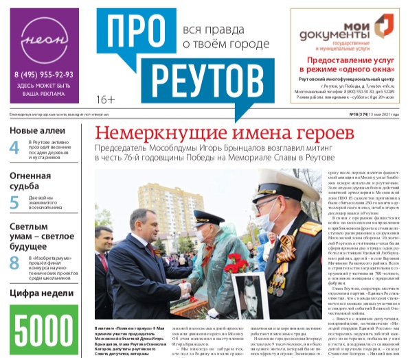 В четверг 13 мая вышел 18-й (374) выпуск бесплатной еженедельной газеты «ПроРеутов».