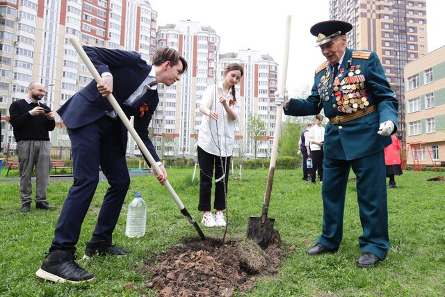 В этом году хорошее дело решили продолжить. Вместе с одиннадцатиклассниками восемь новых деревьев посадили Михаил Иванович Кабанов – фронтовик, в годы Великой Отечественной войны освобождавший Освенцим, Валерий Нечай – председатель Совета ветеранов Реутова, прошедший через войну в Афганистане, и Юрий Иванович Белеко – участник боевых действий в Сирии.