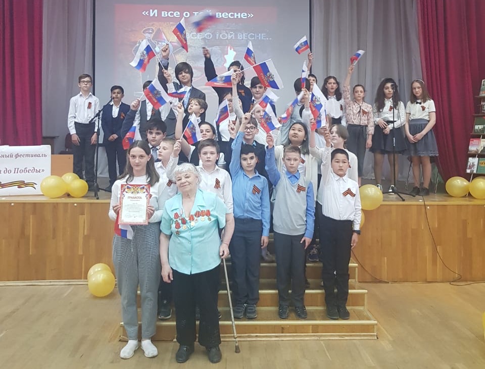 Завершился фестиваль ставшей теперь символом праздника песней «День Победы» (солировали ученицы 7 класса «Б» Варвара Прищепова и Кира Миронова), написанной поэтом Владимиром Харитоновым и композитором Давидом Тухмановым и впервые исполненной к празднованию 30-летия Победы в 1975 году.