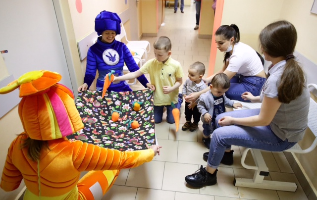 Вместе с депутатом в поликлинику пришли и аниматоры, которые не давали маленьким пациентам и их родителям грустить перед врачебным приёмом.