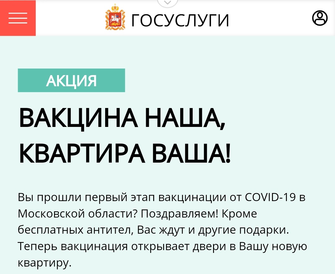 Уточняется, что после того, как введен первый компонент вакцины, необходимо подать заявку на портале «Госуслуги»: - перейти по ссылке uslugi.mosreg.ru/vaccine_action; - заполнить данные: ФИО, дата рождения, СНИЛС, паспорт, полис ОМС; - подтвердить согласие с правилами проведения розыгрыша; - получить код участника. Ваши данные автоматически проверятся в базе ЕМИАС. Если все в порядке — вас зарегистрирует. Если данных нет - обратитесь в то учреждение, где делали прививку.