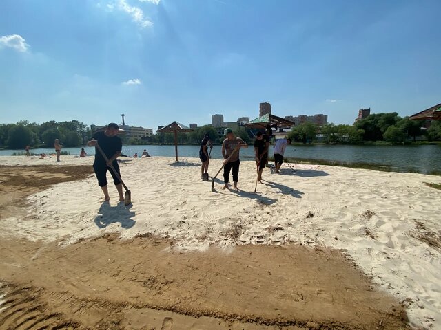 Привыкшие к отдыху у воды горожане были немало удивлены переменами, произошедшими в пляжной зоне парка «Фабричный пруд». Буквально за два дняприбрежная территория поменяла свой цвет на золотисто-белый благодаря завезённому сюда высококачественному песку.
