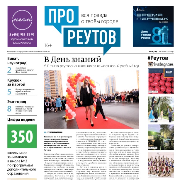 В четверг 2 сентября вышел 34-й (390) выпуск бесплатной еженедельной газеты «ПроРеутов».