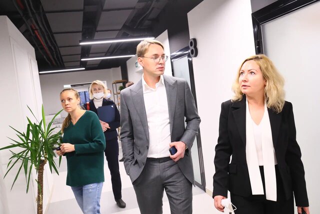 Завершился визит в городской округ в муниципальном коворкинге Open. Директор НО «Реутовский городской фонд поддержки малого предпринимательства» Элла Заган показала мини-офисы, студию видеозаписи, зону open space и кухню.