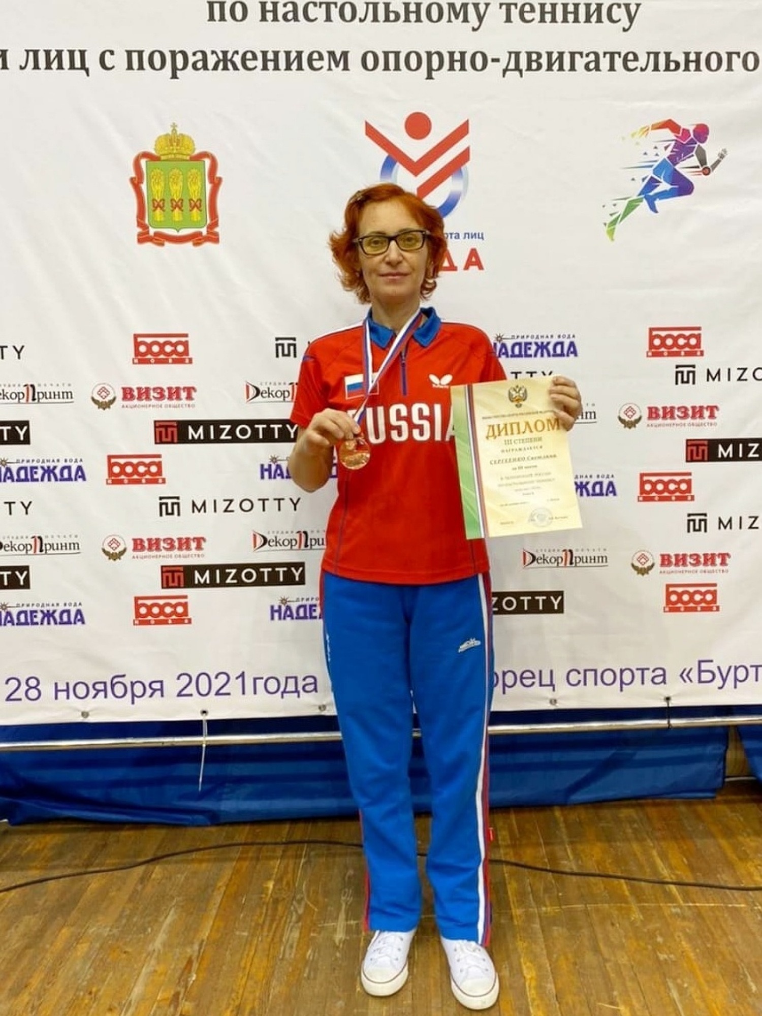 Представительница реутовского спортивно-оздоровительного клуба инвалидов «Риск-М» Светлана Сергеенко уже много лет успешно выступает на крупных межрегиональных и всероссийских состязаниях по настольному теннису. В этот раз чемпионат России среди людей с ПОДА проходил в Пензе с участием 149 спортсменов из 33 регионов страны. Они соревновались в индивидуальном и командном зачёте. Светлана Сергеенко выступала в личном первенстве против соперниц восьмого функционального класса здоровья. Путь к третьему месту оказался для реутовчанки совсем не простым.