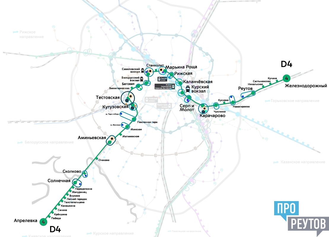 «С запуском МЦД-4 Курский вокзал перестанет быть тупиком для пассажиров, поезда продолжат движение вплоть до Апрелевки. Сейчас, например, чтобы добраться до этого города из Реутова на общественном транспорте нужно потратить около двух с половиной часов и сделать три пересадки. А по диаметру время в пути сократиться в 2 раза. После запуска МЦД-4 реутовчане смогут быстро добраться и до аэропорта Внуково всего с одной пересадкой. Согласно проекту новой транспортной артерии жителям Реутова станет удобней добираться в 23 района Москвы. Без пересадок можно будет доехать до Парка Победы, Мещерского парка и многого другого», - рассказали в пресс-службе.