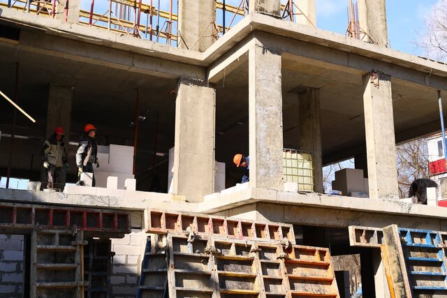 На строительной площадке работают 45 человек и пять единиц техники: два экскаватора, два автокрана и мини-погрузчик. В конце марта — начале апреля по плану у строителей завершение возведения железобетонного монолита, наружных стен и внутренних перегородок.