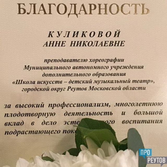 «Педагог-хореограф из Реутова Анна Куликова получила благодарность губернатора Московской области Андрея Воробьева за высокий профессионализм, плодотворную деятельность и большой вклад в дело эстетического воспитания подрастающего поколения», - говорится в сообщении.