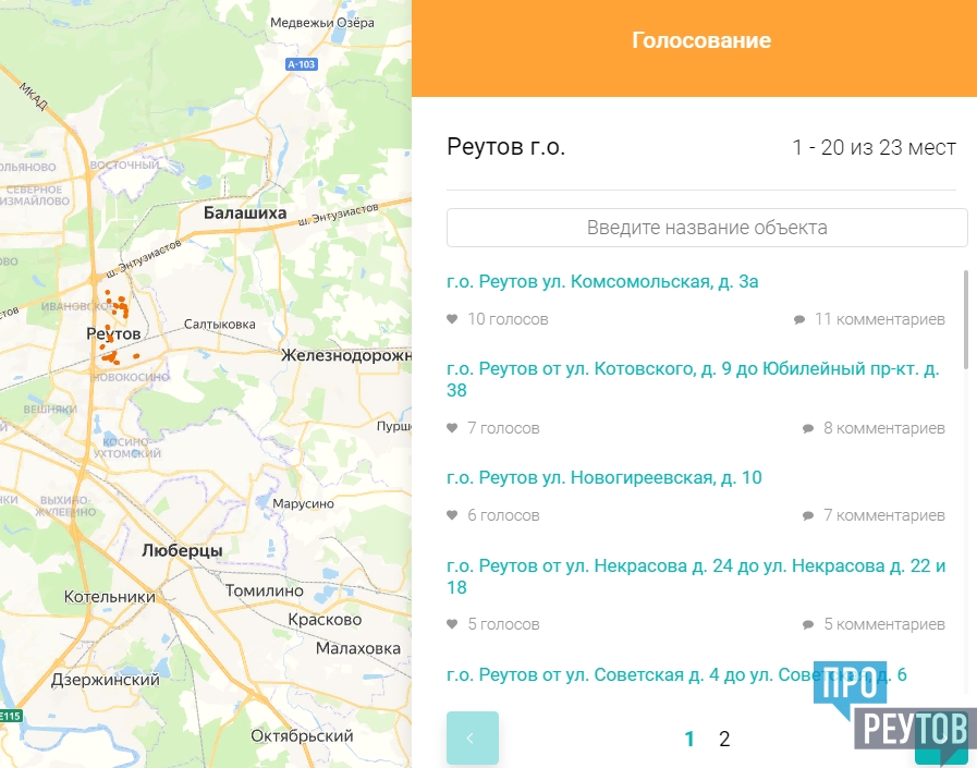 В Реутове для голосования предлагается 20 объектов или территорий, пока с 10 голосами лидирует место по адресу: ул. Комсомольская, д. 3а, 7 голосов набрал участок от ул. Котовского д.9 до Юбилейного проспекта, д. 38.