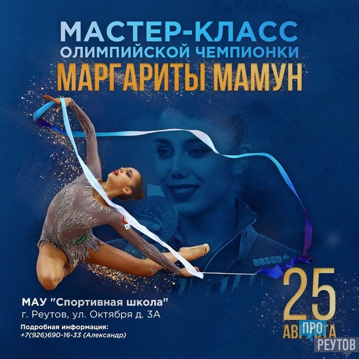 25 августа в Реутовской спортивной школе (бывший ФОК на улице Октября, 3а) состоится мастер-класс олимпийской чемпионки Маргариты Мамун. В ходе встречи пройдёт мастер-класс и живое общение, состоится автограф сессия.