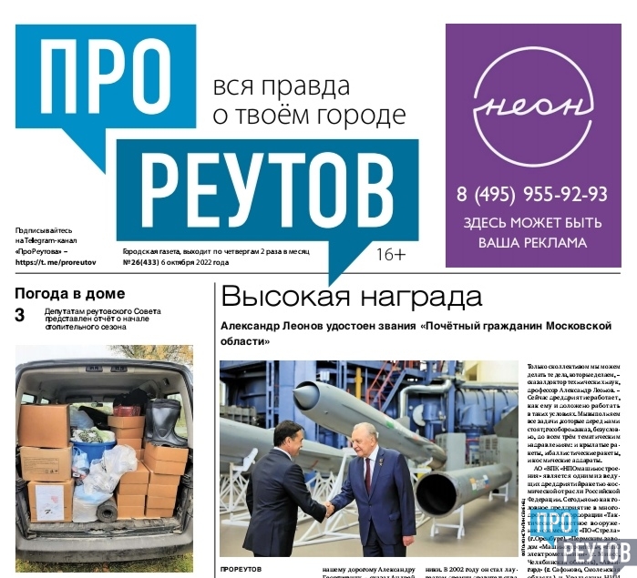 В четверг, 6 октября, вышел 26-й (433) выпуск бесплатной еженедельной газеты «ПроРеутов».