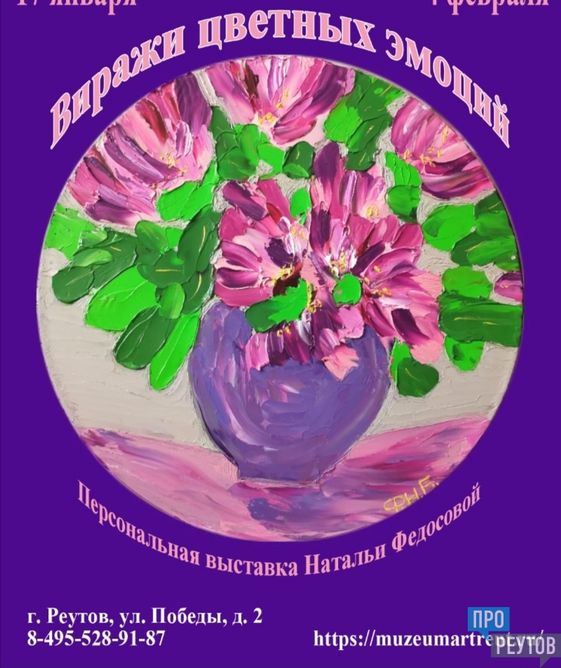 Персональная выставка художника-любителя Натальи Федосовой «Виражи цветных эмоций» состоится в Музейно-выставочном центре Реутова с 16 января по 4 февраля.