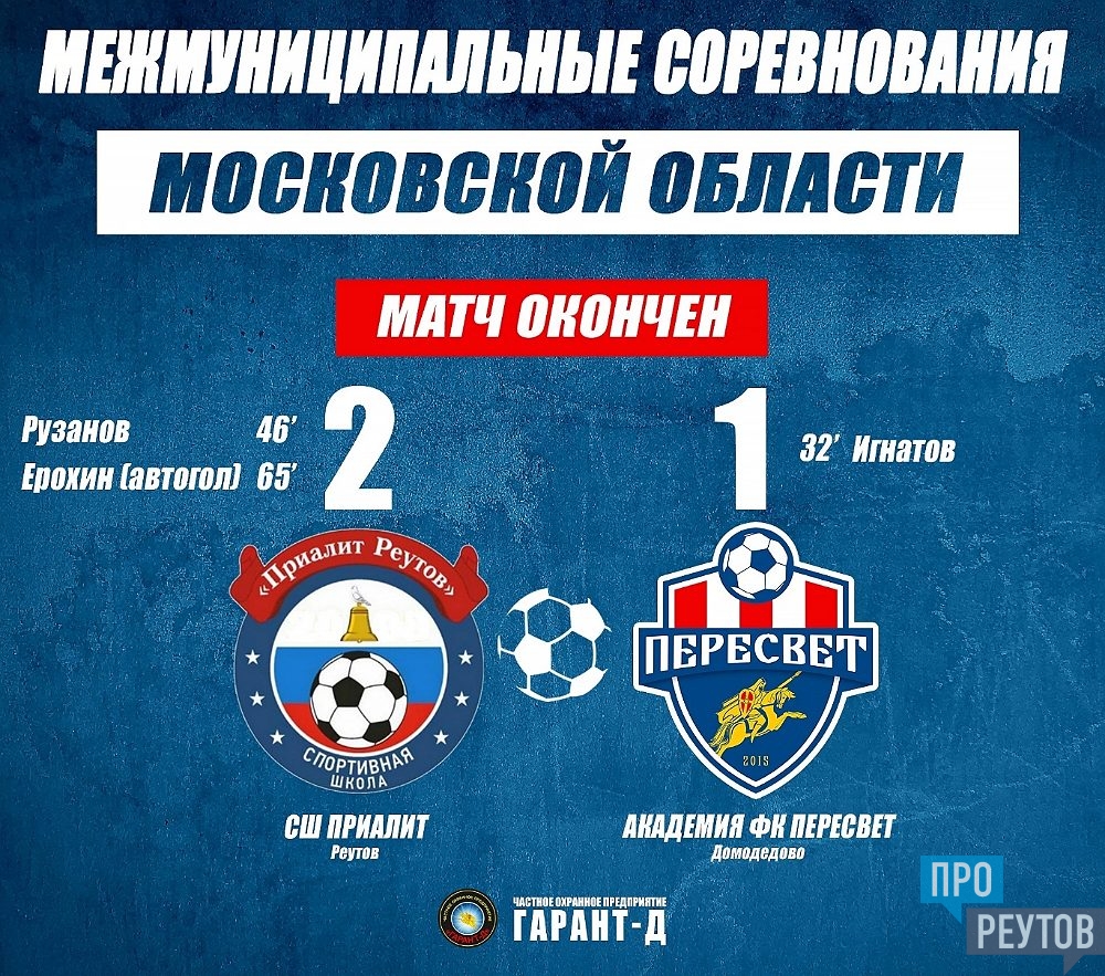 В домашним матче с Академией ФК «Пересвет» из Домодедово реутовчане в упорной борьбе одержали победу 2:1. Гости открыли счет в первом тайме, но в начале второго отличился 17-летний полузащитник «Приалита» Александр Рузавин. Через 20 минут гости неудачно сыграли у своих ворот - автогол. В результате победа реутовчан, что не может не радовать. 29 апреля в гостях они сыграют с командой «Альянс» из Люберец. Будущий соперник крупно проиграл в первом туре, так что у наших футболистов есть все шансы набрать очки и во втором матче турнира.