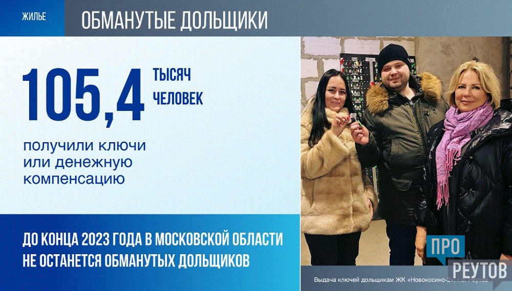 В 2022 в Реутове завершили строительство и выдали ключи дольщикам долгожданного ЖК «Новокосино-2», 16 корпус. По ЖК «Юбилейному» благодаря личной поддержке губернатора было принято решение пойти по процедуре достройки дома, а не выплаты компенсации. На объекте уже работает более 70 строителей. Дольщики получат ключи от квартир в 4-м квартале этого года.