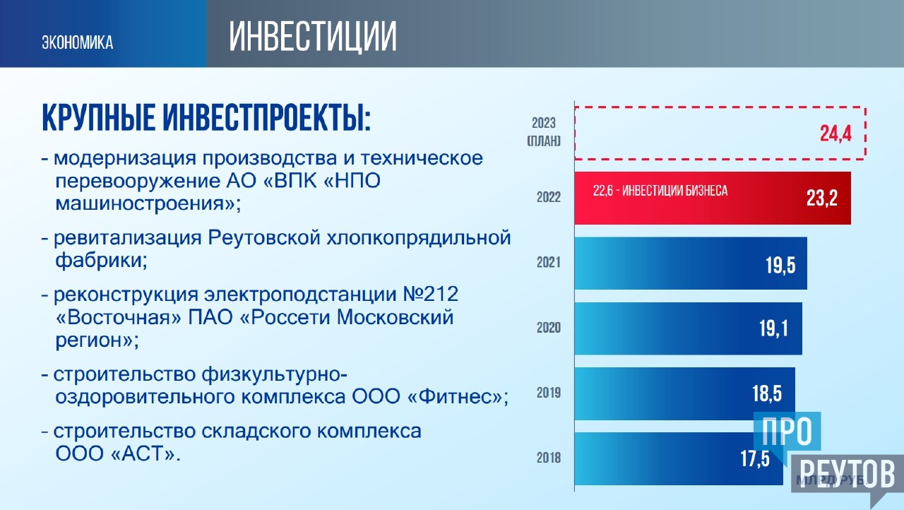 - Объем отгруженных товаров собственного производства, выполненных работ и услуг в 2022 составил 77 млрд. рублей. По прогнозу в 2023 году объемы составят 88 млрд. рублей. Основной объем приходится, конечно, на наше легендарное предприятие «НПО машиностроения», - подчеркнул глава Реутова Станислав каторов в своём ежегодном отчёте перед жителями.