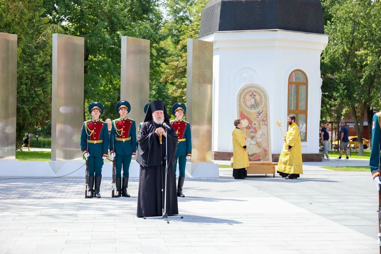 После сказанных памятных слов, минуты молчания, возвращения Вечного огня из часовни Георгия Победоносца на свое историческое место епископ Николай обратился к участникам церемонии с архипастырским словом. Владыка также освятил мозаичную икону великомученика Георгия Победоносца. Образ был создан на пожертвования прихожан Троицкого храма для размещения в часовне, расположенной на территории мемориального комплекса.