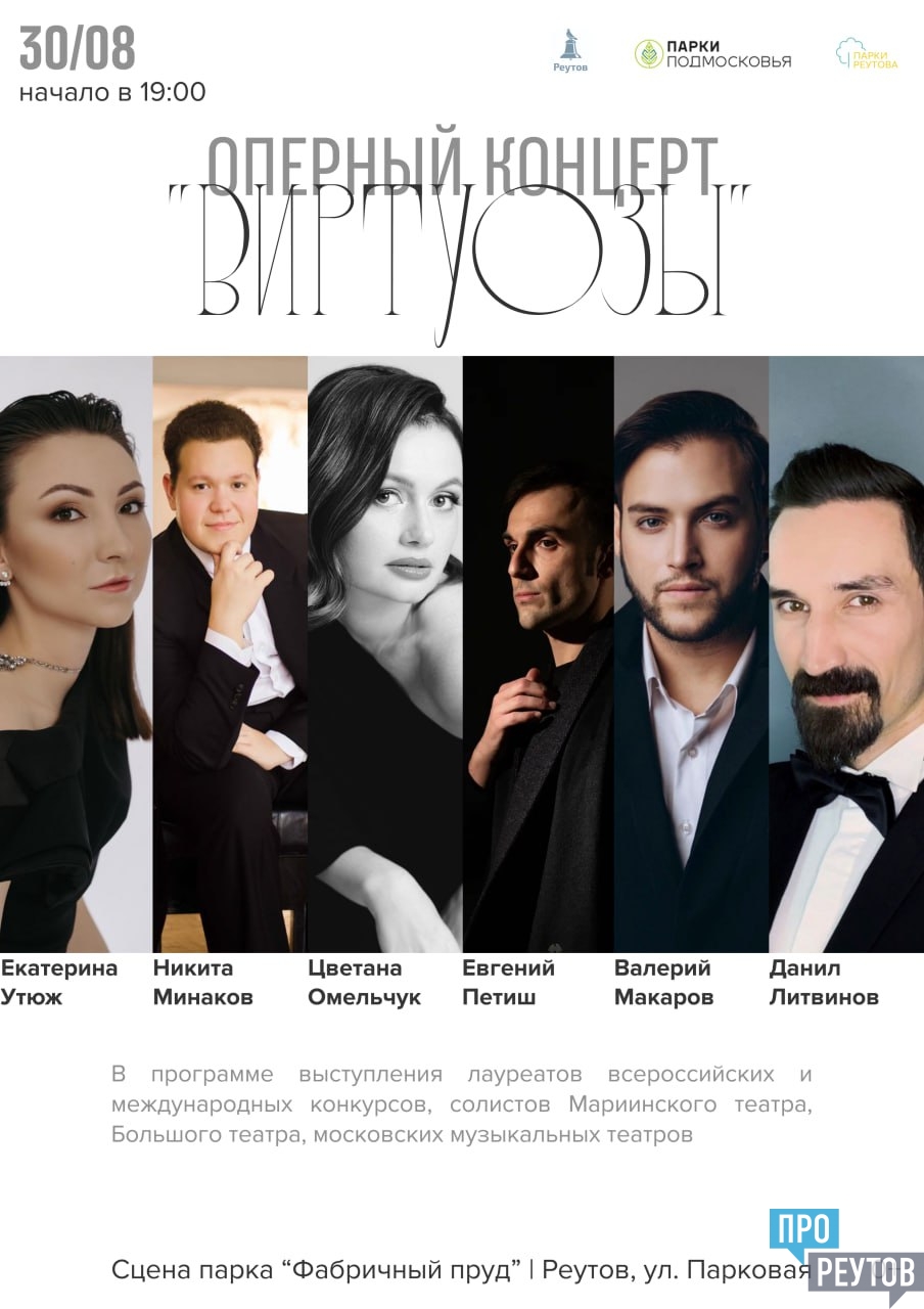 «Продолжаем серию мероприятий в наших парках в рамках проекта губернатора Московской области Андрея Воробьева. В следующую среду, 30 августа, на главной сцене парка «Фабричный пруд» пройдет оперный концерт «Виртуозы». В программе выступления лауреатов всероссийских и международных конкурсов, солистов Мариинского и Большого театров, а также московских музыкальных театров. Приглашаем всех на вечер оперы, концерт начнется в 19:00», - приводятся в сообщении слова Станислава Каторова.