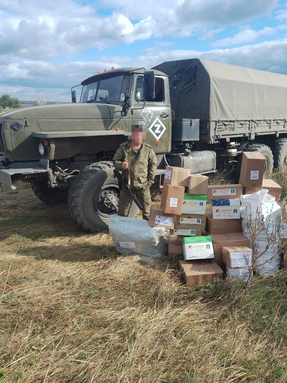 Марина показывает снимок, на котором Сергей стоит на фоне своего «Урала» с новым тентом, ящиков с «гуманитаркой» и не сдерживает эмоций: