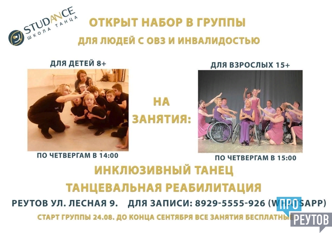 Также открыт набор детей и взрослых с инвалидностью на группу ИНКЛЮЗИВНЫЙ ТАНЕЦ И ТАНЦЕВАЛЬНАЯ РЕАБИЛИТАЦИЯ. До конца сентября занятия будут бесплатными.