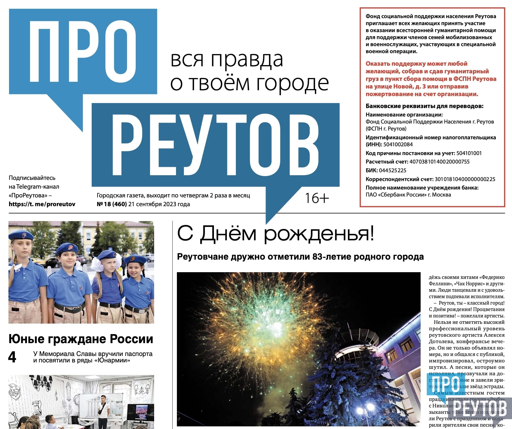 В четверг, 21 сентября, вышел 18-й (460) выпуск бесплатной газеты «ПроРеутов».