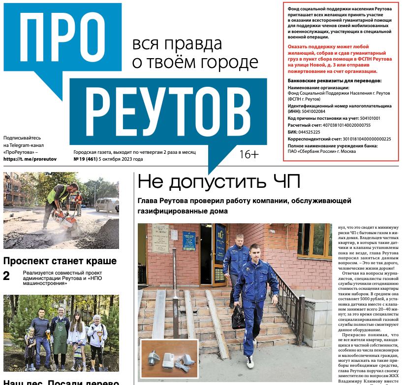 В четверг, 5 октября, вышел 19-й (461) выпуск бесплатной газеты «ПроРеутов».