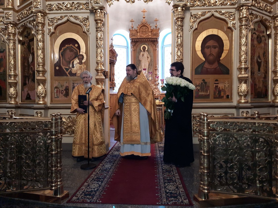 Зачитав по окончании богослужения поздравительный адрес Управляющего Балашихинской епархией епископа Балашихинского и Орехово-Зуевского Николая, отец благочинный вручил юбиляру букет цветов.