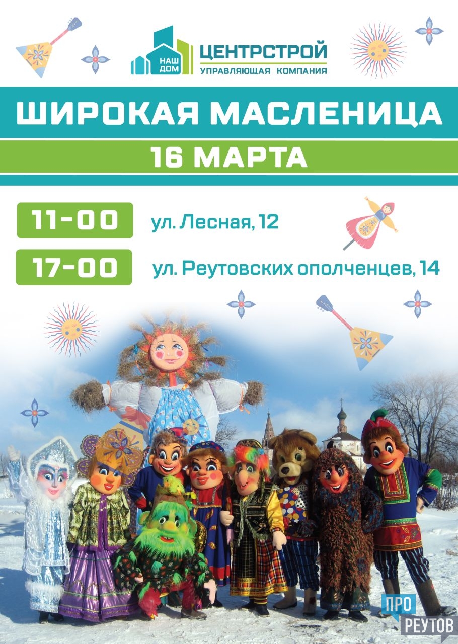 Управляющая компания "Центрстрой" и портал «Наш Дом» приглашает всех жителей на празднование ШИРОКОЙ МАСЛЕНИЦЫ!⠀Вас ждет яркая развлекательная театрализованная программа для детей и взрослых с играми, викторинами и подарками! В увлекательной форме артисты расскажут, как проходил и как назывался на Руси каждый день масляной недели. Театрализованное действо с шуточными музыкальными номерами, частушками, прибаутками покажут 25 ростовых кукол - персонажей из русского фольклора: Скоморохи, Маслёна, Зима, Весна, Красно-Солнышко, Дроля и Матаня, Старики и Старушки, Красные Девицы и Добрые Молодцы, Бабуся-Ягуся, Кикимора, Лешачок-Лесовичок.