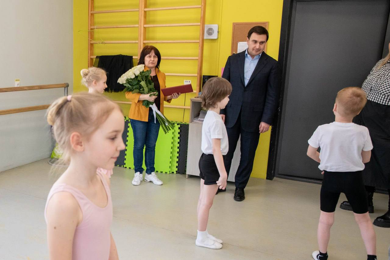 Поздравив директора, глава муниципалитета осмотрел здание центра. Начальник Управления культуры, спорта и молодёжной политики администрации Реутова Анастасия Николаенко показала классы для занятий, концертный зал и стену с наградами.