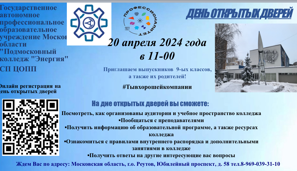 Как "ПроРеутов" уже сообщал, 20 апреля в «Подмосковном колледже «Энергия», как и во всех образовательных организациях федерального проекта "Профессионалитет", состоится Единый День открытых дверей. По словам заведующей реутовским структурным подразделением колледжа Надежды Близняковой, здесь очень ждут в этот день гостей - потенциальных абитуриентов!