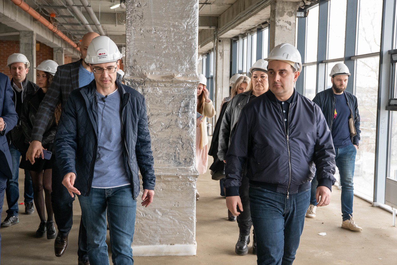 Глава Реутова и его заместители внимательно осмотрели строящийся ФОК внутри и снаружи, сверили ситуацию на объекте с графиком выполнения работ и задали ряд уточняющих вопросов представителю застройщика.