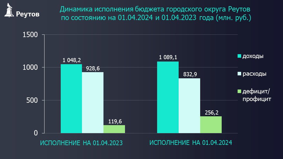 По итогам марта 2024 года поступления доходов в бюджет городского округа Реутов составили 1 089,1 млн. рублей или 15,2 % к годовому плану, в том числе по налоговым и неналоговым доходам поступило 532,4 млн. рублей или 18 % к годовому плану.