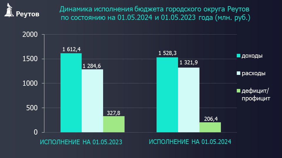 По итогам апреля 2024 года поступления доходов в бюджет городского округа Реутов составили 1 528,3 млн. рублей или 21,3% к годовому плану, в том числе по налоговым и неналоговым доходам поступило 686,5 млн. рублей или 23,2 % к годовому плану.
