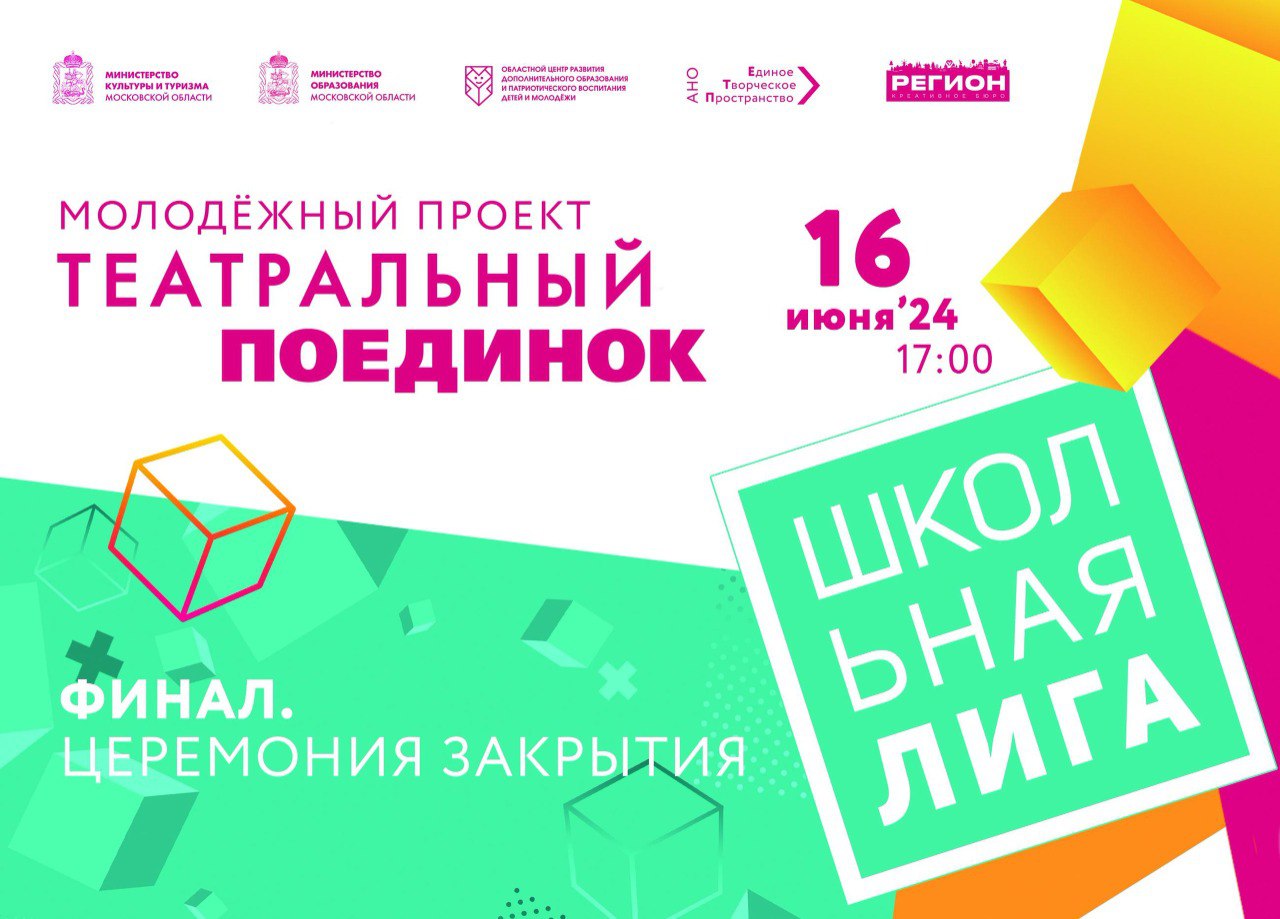 - школьный театр «Кракелюр» (г. Дедовск), школьный театр «Рожденные сиять» (ЗАТО г. о. Звездный городок) театральная студия «Бригада П» (г. Одинцово). Гости увидят заключительную игру проекта, по результатам которой три команды-финалиста распределятся по местам на пьедестале почета. Завершится праздничный вечер церемонией закрытия и награждением участников, финалистов и победителей проекта. Начало мероприятия в 17:00. Необходима предварительная регистрация (https://clck.ru/3BEwAk) В первом сезоне проекта «Театральный поединок. Школьная лига» приняли участие более 50 коллективов из 31 населенного пункта Подмосковья