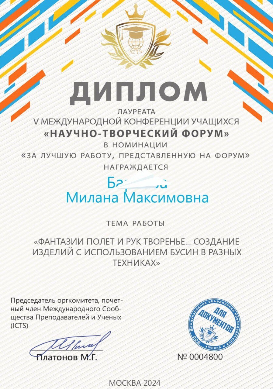 Международное объединение преподавателей и ученых (International Collaboration of Teachers and Scientists (ICTS)), а также организационный комитет пригласили всех желающих принять участие в Ѵ Международной конференции учащихся «НАУЧНО- ТВОРЧЕСКИЙ ФОРУМ». От реутовской школы №6 в конференции приняла участие Милана Б., ученица 8-в класса, по направлению «Технология», под руководством учителя Половко Л.П. Жюри высоко оценило работу Миланы. Она награждена Дипломом лауреата конференции в номинации «За лучшую работу, представленную на форум».
