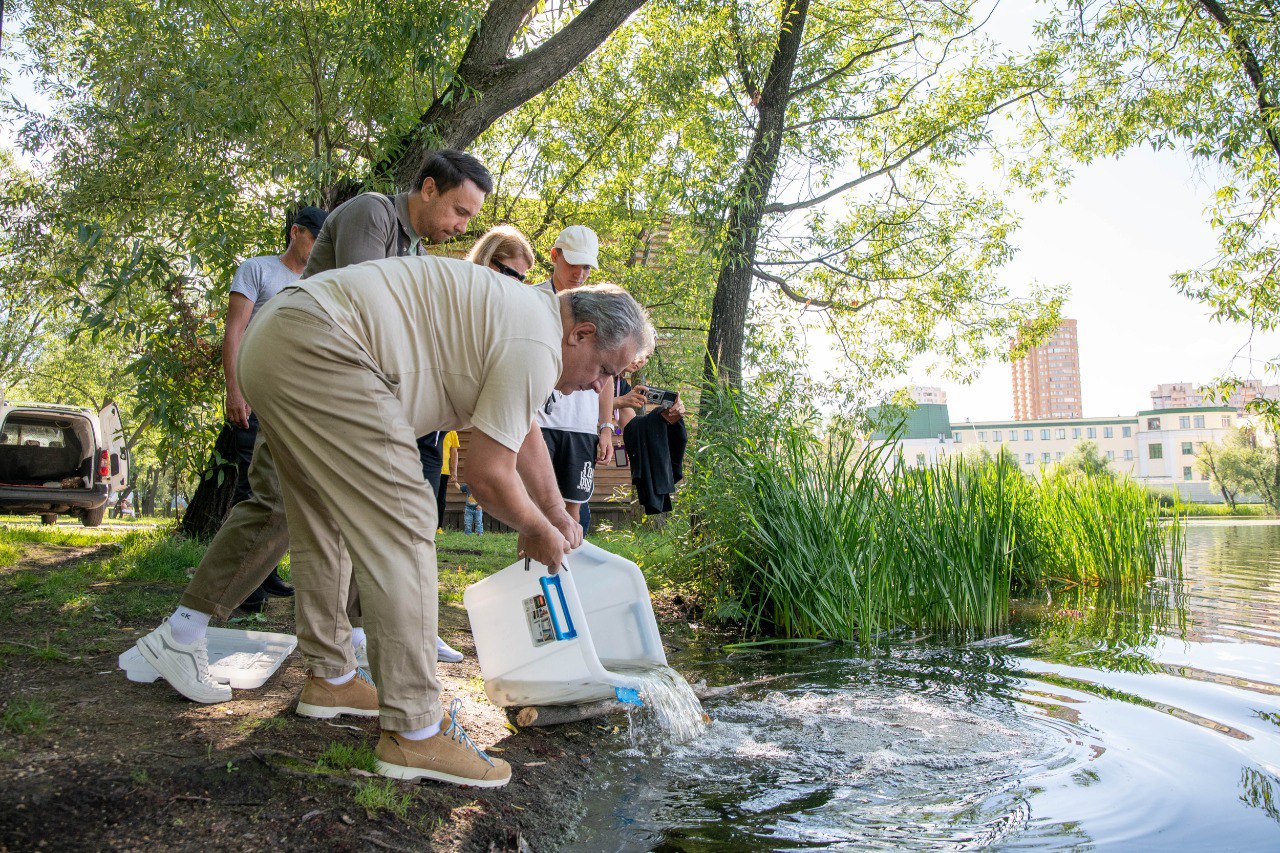 Более 300 мальков карпа кои и красного окуня выпустили в Фабричный пруд.