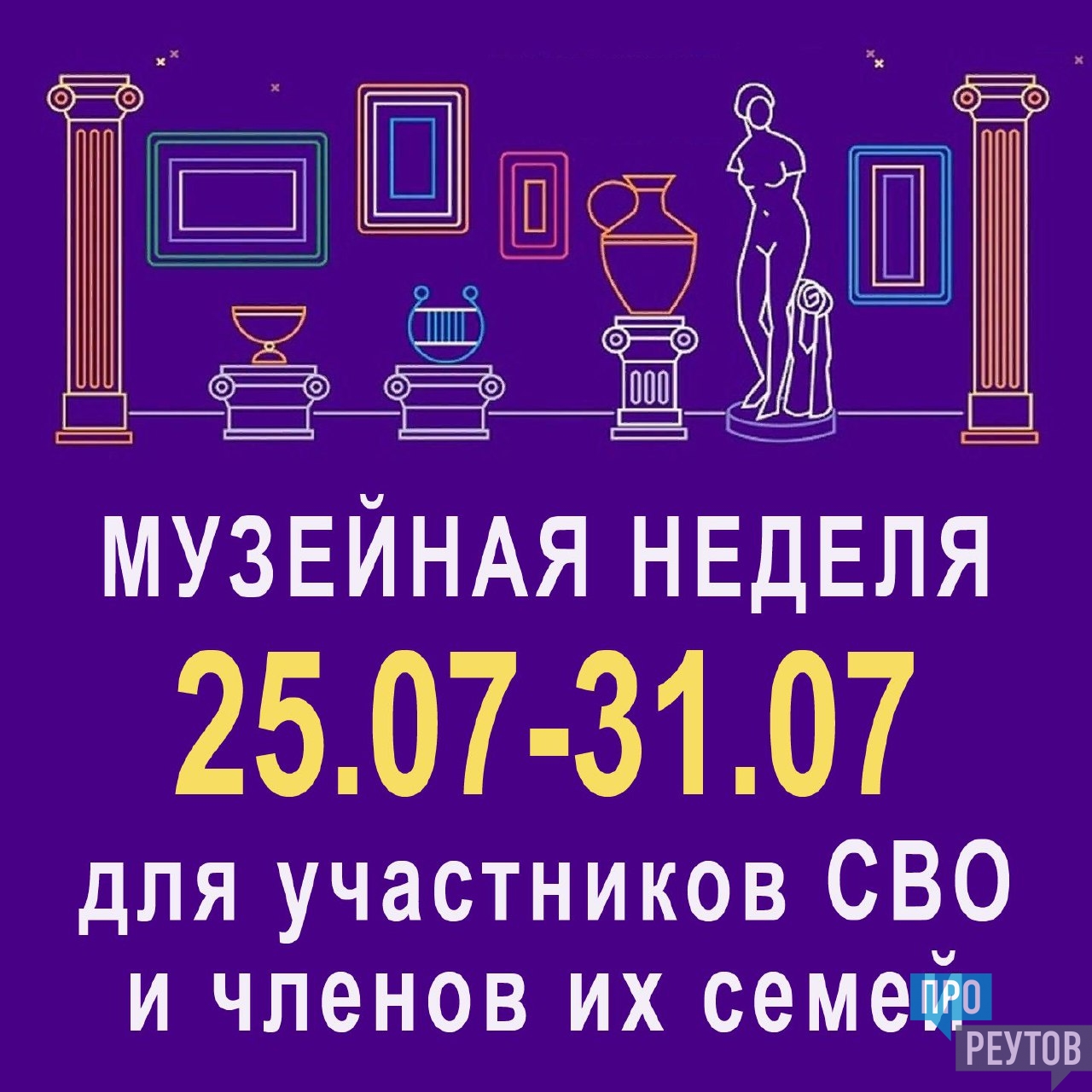 Друзья! Музейно-выставочный центр присоединяется к акции «Музейная неделя» для участников СВО и членов их семей. С 25 по 31 июля для них будет свободный вход на наши выставки и в краеведческий музей. Бесплатный билет приобретайте в кассе МУК «МВЦ».
