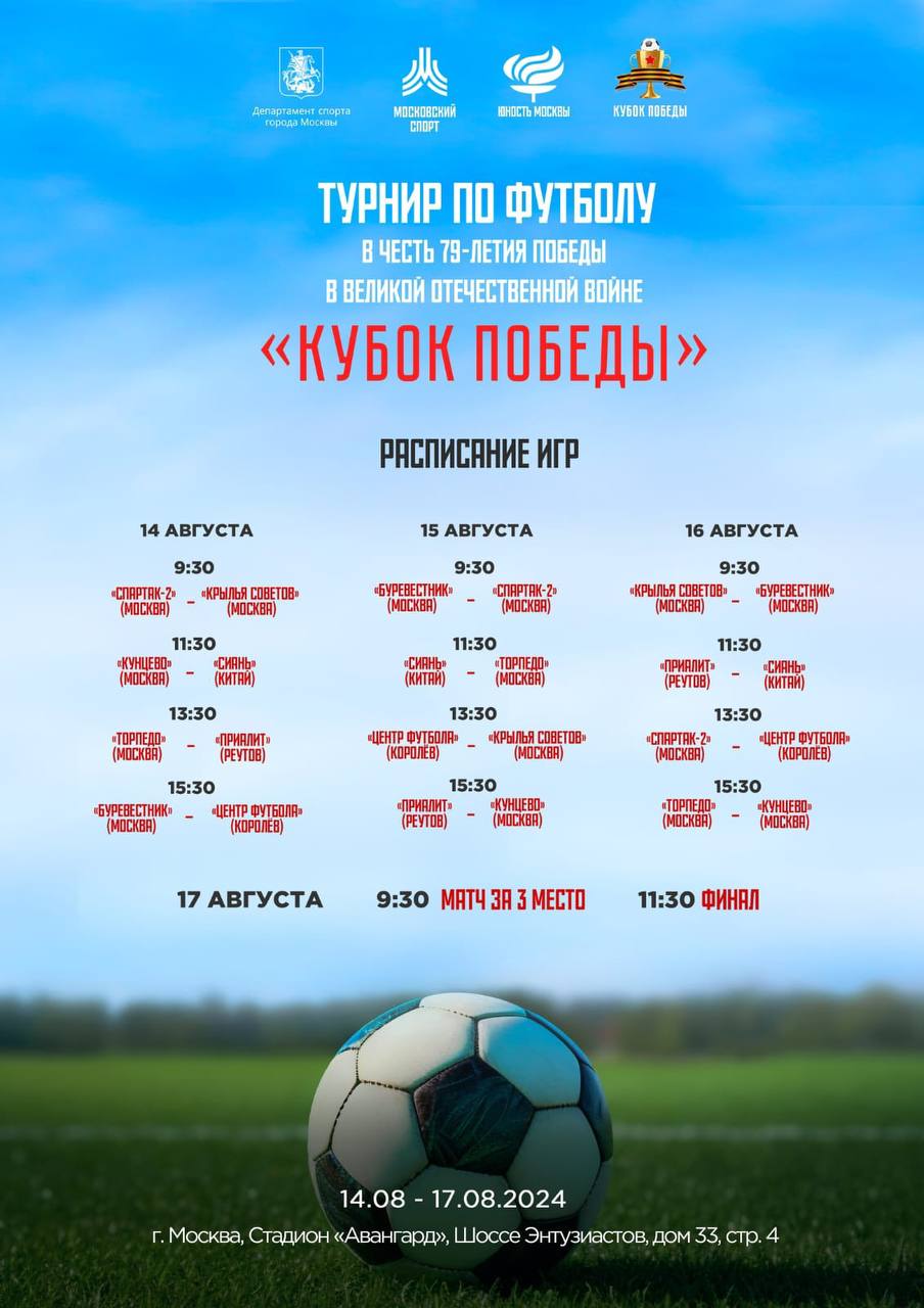 На столичном стадионе «Авангард» проходит юбилейный X турнир по футболу «Кубок Победы» среди юношей, посвящённый 79-летию Победы в Великой Отечественной войне, который организует и проводит ГБУ ДО «ФСО «Юность Москвы».