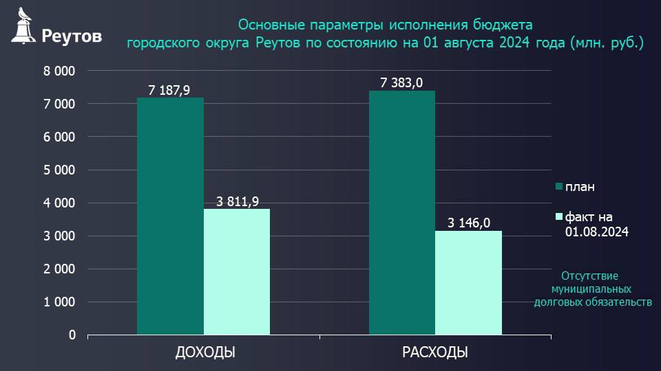 Годовой план поступления доходов в бюджет городского округа Реутов выполнен на 53%. На данный момент речь идёт о сумме в 3811, 9 млн рублей, включая налоговые и не налоговые доходы, по которым в казну города поступило более 1800 млн рублей. Годовой план по этой категории доходов выполнен на 62,2%.