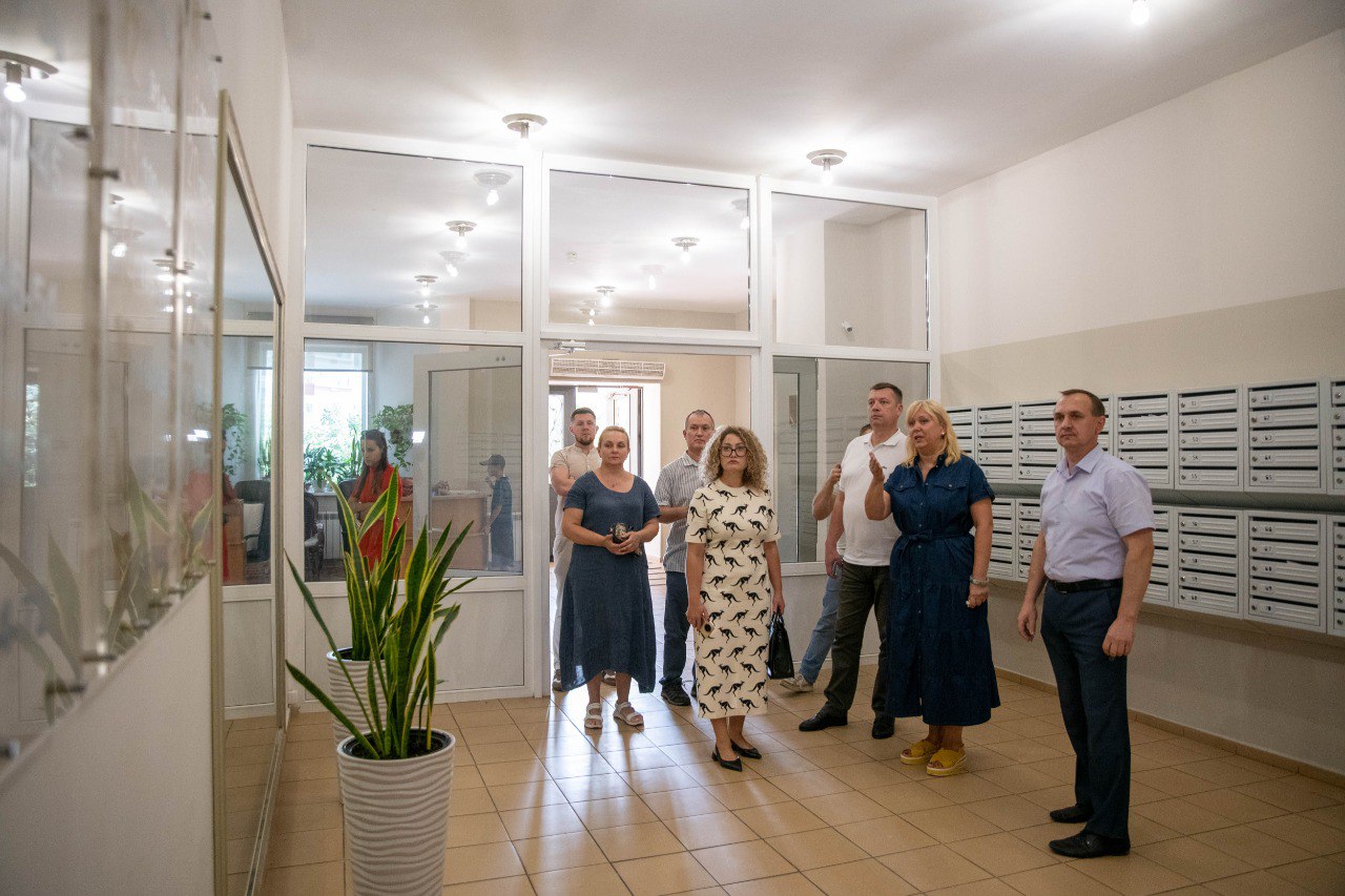 Осмотр начался с придомовой территории, которую жители украсили клумбами с разнообразными цветами. Внутри подъезда также было множество цветов, а ещё комфортные диваны, художественно оформленные светильники и шикарное зеркало во всю стену.