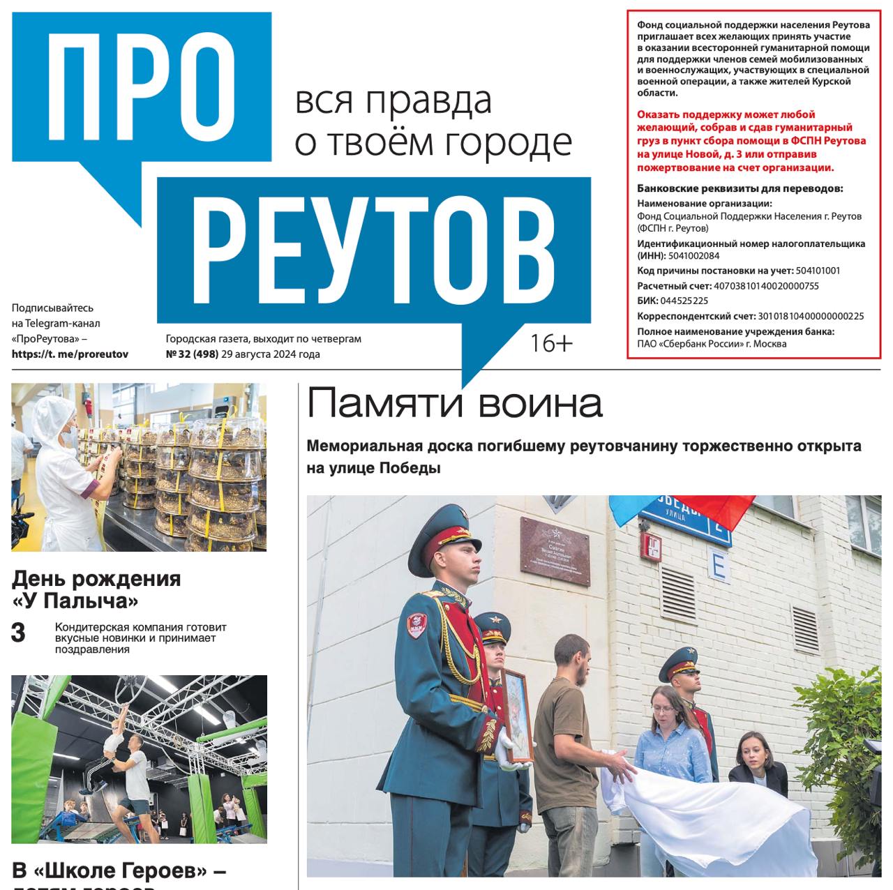 В четверг, 29 августа, вышел 32-й (498) выпуск бесплатной газеты «ПроРеутов».