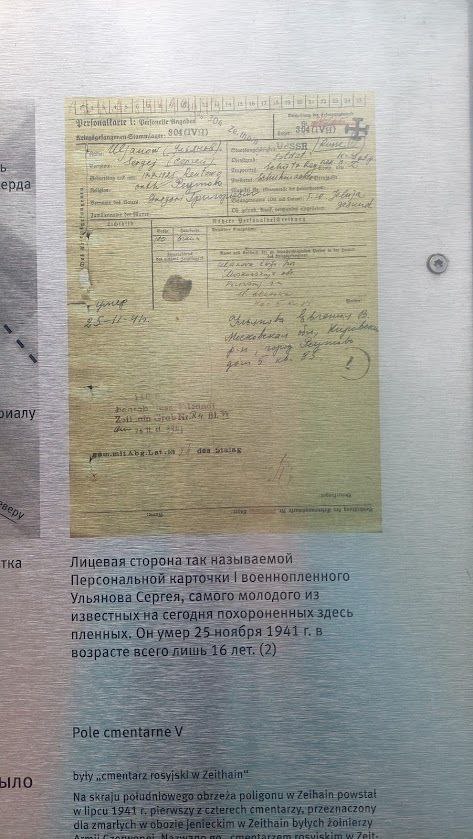 Самый юный воин из тех, чьё имя удалось установить, — 16-летний Сергей Григорьевич Ульянов. В учётной карточке военнопленного местом жительства указано: Московская область, город Реутово, д. 5, кв. 85. Мать — Ульянова Евгения В. Попал в плен 5.10.1941 под Ельней. Гражданская профессия — сапожник. Умер 25.11.1941.